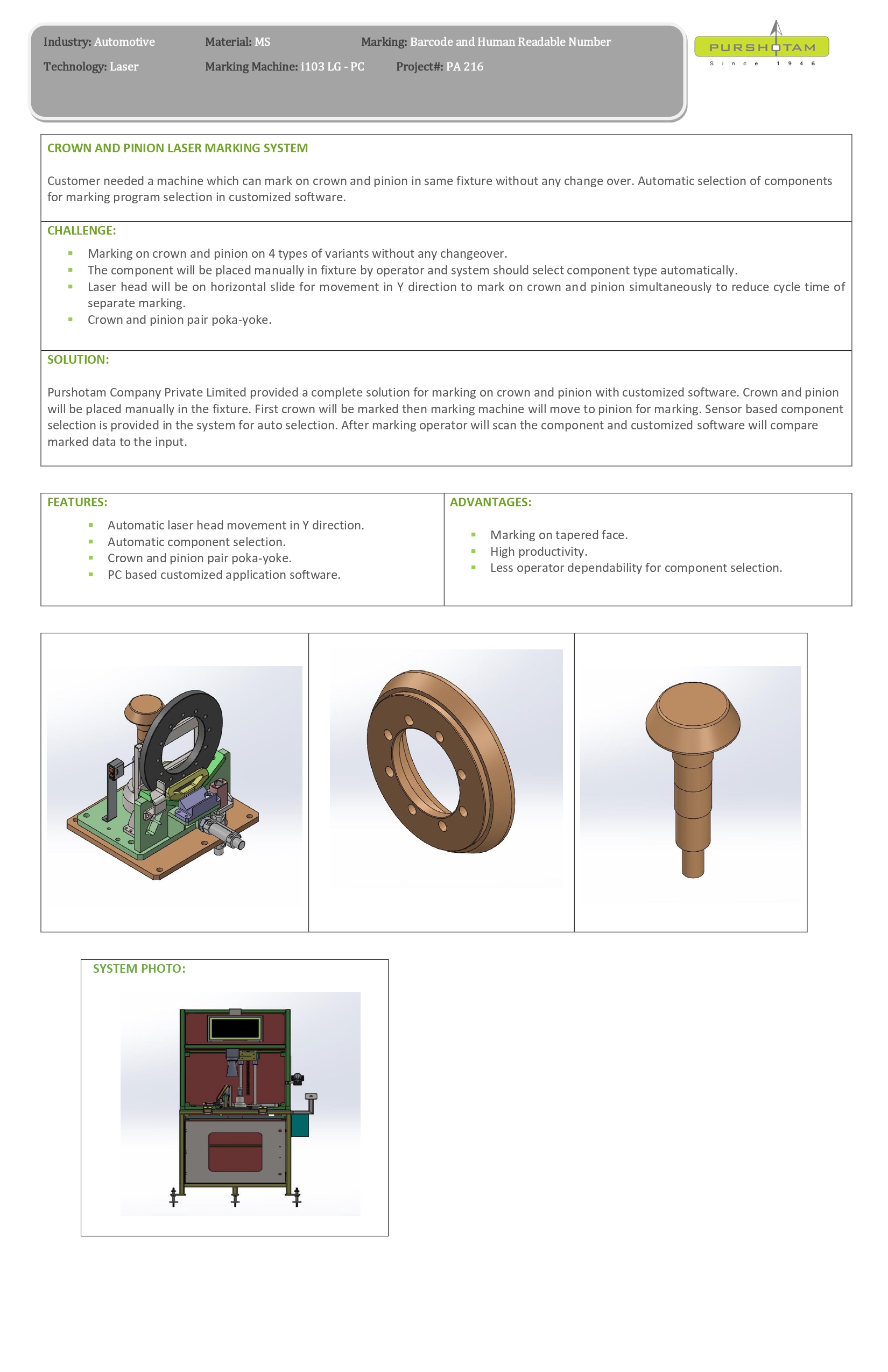 A machine which can mark on crown and pinion in same fixture without any change over. Automatic selection of components for marking program selection in customized software.